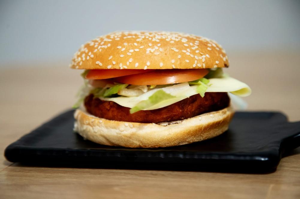 Frango empanado, mussarela, alface e tomate no pao brioche
