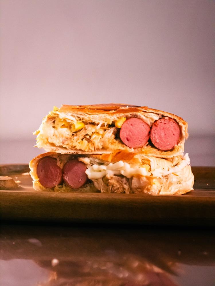 2 salsichas, frango, mussarela, catupiry, milho e batata palha