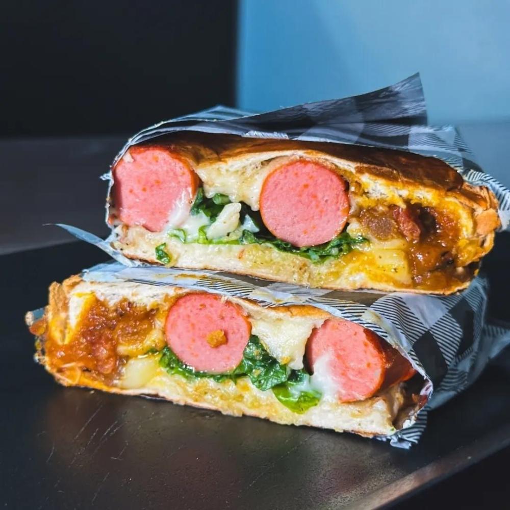 2 salsichas, mussarela, catupiry, geleia de bacon, rucula e batata palha